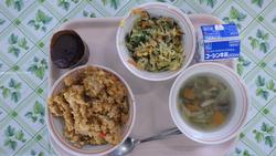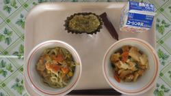26日(木)ごはん たらのやさいあんかけ もやしのごまみそスープ まっちゃきなこまめ ぎゅうにゅう