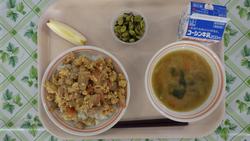 12日(木)おやこどん ひたしまめ ごまみそけんちんじる りんご ぎゅうにゅう