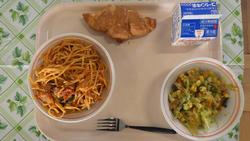 13日(金)ツナとトマトのスパゲッティ バジルサラダ チョコクロワッサン ぎゅうにゅう