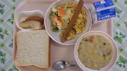 19日(木)【またいっぱいたべたいなきゅうしょく】ブレッド・ミーツ ウインナー スクランブルエッグ ポテトのフレンチサラダ