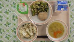 こまつなとちくわのしょうゆごまあぶらソテー ABCスープ ヨーグルト ぎゅうにゅう