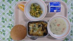 25日(水)【フランスきゅうしょく】ミニパン なすとペンネのミートグラタン にんじんドレッシングサラダ クラムチャウダー