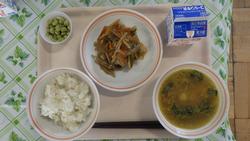 6日(金)ごはん くきわかめのきんぴら なまあげのみそチーズやき かきたまじる こくさんオレンジ ぎゅうにゅう