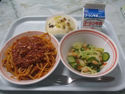 | 3日 | 水 | スパゲティーミートソース ビーンズサラダ さつまいもとチョコチップの むしパン ぎゅうにゅう |