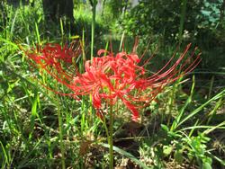 体育館への入り口、ちょうど池の脇になりますが、数輪の彼岸花が咲きました。