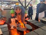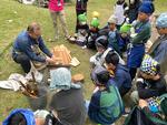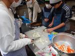 2日目は、朝の集いから始まり、朝食や退所点検を済ませ、野外炊飯でカレー作りをしました。退所点検では、ふとんのたたみ方に苦戦した部屋が多くありましたが、部屋の片付けや施設の掃除を隅々まで行い、何度も自分たちで確認したり、隣の部屋に教えたりしている様子が見られました。野外炊飯では、薪を割ってかまどの火をおこしたり、野菜を切ったり、米を研いだり、班で役割を分担して協力しながら、夢中になってカレー作りに取り組んでいました。なかなか火が付かなかったり、大きなにんじんを切るのが難しかったりと大変なところもありましたが、どの班もおいしいカレーを完成させることができました。「自分で作ったカレーは今までで一番おいしかった!」「いつもお母さんが作ってくれているけれど、思ったよりも大変だった!」と、自分たちでカレーを作ることの楽しさや大変さを感じていました。はじめは小雨が降っていましたが、いただきますの時間にはぴたりと止み、曇り空の下には、みんなの笑顔が輝いていました。
