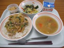 | 17日 | 火 | ぶたキムチどん わかめサラダ たまねぎととうふのみそしる わふうとうにゅうデザート ぎゅうにゅう |