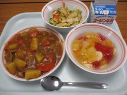 今日の「6年生リクエストメニュー」は、給食の王道「カレーライス」に、不動の人気「フルーツポンチ」です。「カリカリサラダ」は、ポテトチップがかかっていて、以外と人気のあるサラダです。 | |
