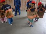 消防士さんが実際に着用する防火服を一人ずつ着させていただきました。初めて着る防火服に「重いから着るの大変だ」「あたたかい!!」などの反応をしながら、嬉しそうに着ていました。