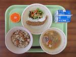 | 今日の給食は、ご飯、鯵の香味ソースかけ、干ぴょうの胡麻酢和え、豆豆汁でした。干ぴょうの胡麻酢和え(ごま酢あえ)は、干ぴょうの名産地である栃木県の郷土料理として古くから親しまれてきた料理です。特定の考案者や明確な誕生年月の記録はありませんが、その歴史は「干ぴょうの生産」と密接に結びついています。干ぴょうの原料は、ウリ科の植物であるユウガオ(夕顔)の果実を細長く剥いて乾燥させたものです。現在、干ぴょうは栃木県で全国生産量の90%以上を占めており、「かんぴょう王国」とも呼ばれています。栃木県でのユウガオ栽培の歴史は、約300年前に遡るとされています。正徳2年(1712年)に、当時の下野壬生藩主(栃木県)であった鳥居忠英(とりい ただてる)が、近江国(現在の滋賀県)からユウガオの種子を取り寄せ、栽培に成功したことが始まりと伝えられています。この成功により、干ぴょう生産が地域に定着しました。干ぴょうの生産が盛んになるにつれ、売り物にならない短い干ぴょうの切れ端や、大量に収穫された干ぴょうを日常の食卓で様々に工夫して食べるようになりました。干ぴょうの独特な食感と、ごまの香ばしさ、酢のさっぱりとした風味が非常によく合うことから、「干ぴょうの胡麻酢和え」は、この地域で最も一般的な干ぴょう料理の一つとして定着しました。今日の給食もおいしかったです。 | ||