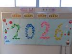 今日は5年生の書き初めです。「美しい空」を書きました。バランスを考えながら集中して書いていました。1年生の掲示板には午の折り紙が登場しました。2026の文字を作っている一つ一つが午の形をした折り紙になっています。