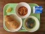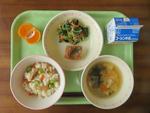 2日(月)   ご飯・鮭の竜田揚げ・胡麻和え・豆豆汁・オレンジ・牛乳
