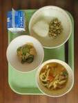 20日(金)   カレーうどん・焼き塩むすび・ポップビーンズ・ピリッと和え・牛乳