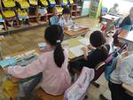 今日は1年生の学習の様子をお伝えします。まずは算数で図形の学習です。三角形の向きを変えたり、並べ替えたりしながら色々な形を作っていました。また、国語の学習では作った乗り物カードを入れるバックを作っていました。写真や本を隣に置いて、とっても楽しそうに作っていました。生活科の学習では球根の観察をしていました。球根を見ながら「きっとピンクの花が咲くよ」と話していました。お勉強を楽しみながら頑張っている一年生です。