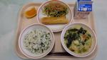 「わかめご飯」「サケとチーズの春巻き」「おかかあえ」「かきたま汁」「きよみオレンジ」「牛乳」 | |