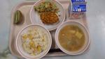 「麻婆丼」「しめじと卵のスープ」「うぐいすきなこ豆」「牛乳」 | |