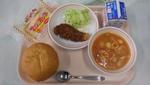 「豚肉と大豆のカレーライス」「ひじきサラダ」「フルーツポンチ」「牛乳」 | |