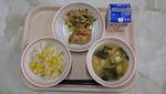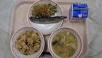 「じゃこご飯」「ポテトとチーズの春巻き」「ほうれん草とえのきんpのりサラダ」「豚汁」「牛乳」 | |