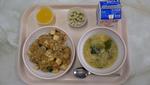 「麻婆丼」「しめじと卵のスープ」「うぐいすきなこ豆」「オレンジゼリー」「牛乳」 | |