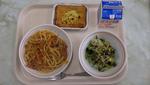 「スパゲティミートソース」「かいそうとじゃこのサラダ「スイートポテトパイ」「牛乳」 |