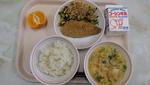 「ご飯」「あじのかわり揚げ」「卵入りキムチスープ」「ぽんかん」「牛乳」 |