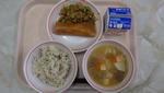「さつまいもご飯」「鮭の梅しそ焼き」「青菜のごまあえ」「なめこ汁」「牛乳」 | |