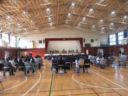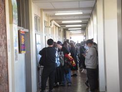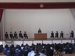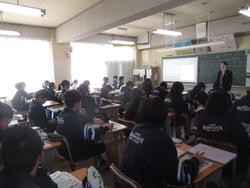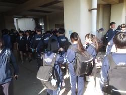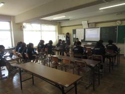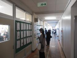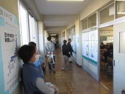 授業参観には、在校生の保護者以外にも、次年度入学予定の小学6年生とその保護者の方も参観に来ていました。そのためか、とくに1年生のフロアは参観者が多かったようです。1年生は3時間目には、体育館で「働く人に話を聞く」をテーマに行っている総合学習の発表会を行っていました。