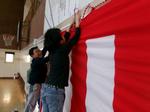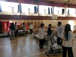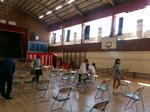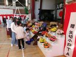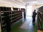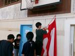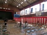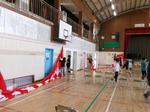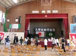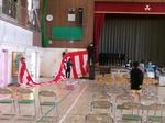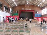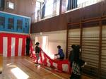 教室の机の上には、一人分ごとに教科書等が置かれました。体育館の紅白幕もだんだんはられてきています。ひな壇にはお花を置いています。ステージから演台を降ろして、カバーを掛けました。入学おめでとうの横看板や日の丸も吊り上げます。
