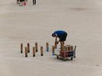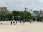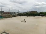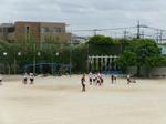 3年生は、体育でミニトラックを使ったリレーを行っていました。また、ハードルの授業に向けて、教務主任の先生がペットボトルを使った自作の教具を設定していました。ぶつかっても足が痛くならないように工夫しています。