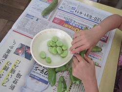 ●写真1枚目・2枚目・3枚目…さやの中に豆がいくつ入っているのか、そら豆の色や形や匂いがどのようなのかを確認しながらさやむきを進めました。