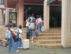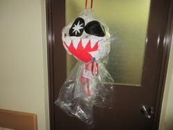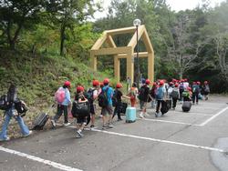 ●写真1枚目…さしま少年自然の家に到着しました。●写真2枚目…入所式を終え、館内に入っていきます。●写真3枚目…子どもたちが作った小さなてるてる坊主が入った大きなてるてる坊主がドアに掛けられていました。