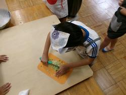 ●写真1枚目…ネギを切っています。●写真2枚目・3枚目…「のばす」作業を協力して行っています。