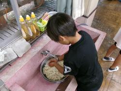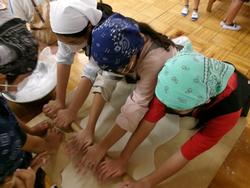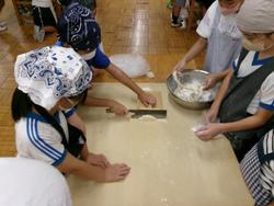 林間学園2日目を迎えました。午前中、うどん打ちの体験活動に取り組み、約3時間かけて手打ちうどんを作りました。