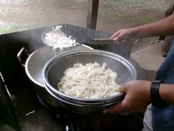 ●写真1枚目…切ったうどんをほぐしています。●写真2枚目…うどんがゆであがりました。●写真3枚目…水をかけてうどんを冷やしています。