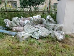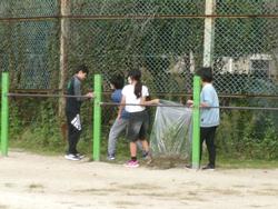 ●写真1枚目…ネットの裏の大きく伸びた草を取っています。●写真2枚目…体育館の裏まできれいにしました。●写真3枚目…大きなビニール袋にこれだけの草が取れました。
