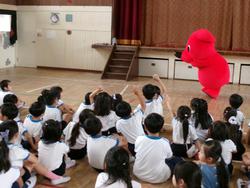 ●写真1枚目…チーバくんが姿を現しました。●写真2枚目…クイズを楽しんでいます。「チーバくんを横から見るとどんな形に見えますか?」●写真3枚目…ジャンケンを楽しんでいます。