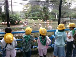 ●写真1枚目…動物公園に到着しました。●写真2枚目…動物の姿が見え始めました。●写真3枚目…フラミンゴを見学しています。