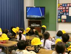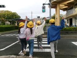 ●写真1枚目…映像を見て交通ルールや道路の歩き方を確認しました。●写真2枚目…信号のない横断歩道の渡り方を確認しました。●写真3枚目…信号のある横断歩道の渡り方を確認しました。