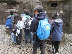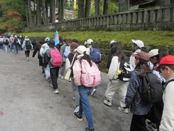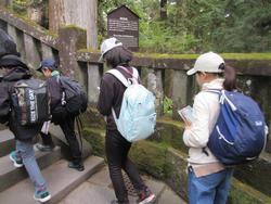 ●写真1枚目…東照宮の参道を歩いています。●写真2枚目…奥宮を目指して歩いています。●写真3枚目…チェックポイントで先生のサインをもらっています。
