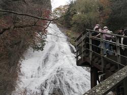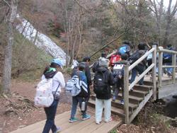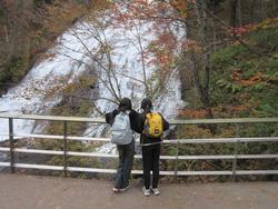 ●写真1枚目…ハイキングのゴール地点の湯滝が見えてきました。●写真2枚目…湯滝に到着しました。●写真3枚目…力強く流れる湯滝に魅了されています。