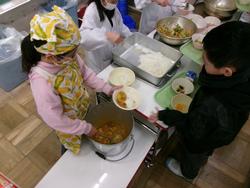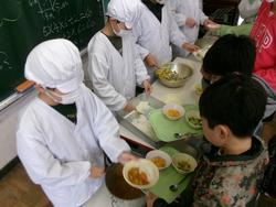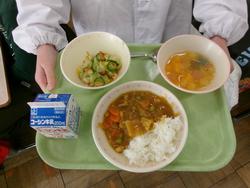 ●写真1枚目・2枚目…給食当番が矢切米カレーを盛り付けています。●写真3枚目…今日の給食です。