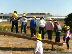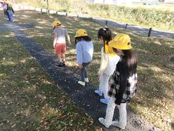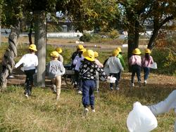 ●写真1枚目…親水広場に到着しました。●写真2枚目…秋を見つけに木の下に走って向かっています。●写真3枚目…どんぐりを拾っています。