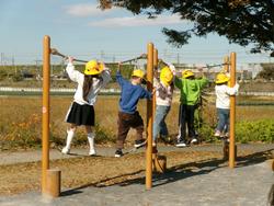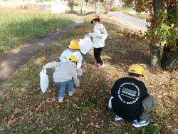 ●写真1枚目・2枚目…どんぐりや落ち葉を拾って袋の中に入れています。●写真3枚目…拾い終わると遊具で遊びました。