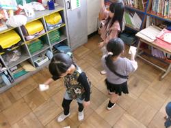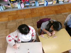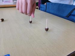 1年生は生活科の学習で「秋」について学んでいます。一昨日、坂川親水広場で拾ってきたどんぐりでコマを作りました。