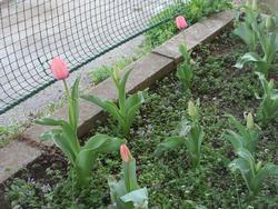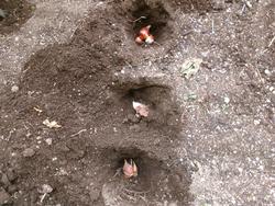 ●写真1枚目…球根を植え付けています。●写真2枚目…掘り起こした穴に球根を入れていきました。●写真3枚目…この4月に咲いたチューリップです。このように花開いてくれることを願っています。