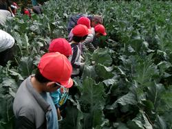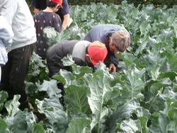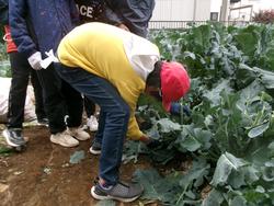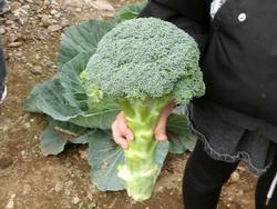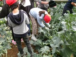 ●写真1枚目…収穫前のブロッコリー。大きく育っています。●写真2枚目…最初に栽培委員がお手本を見せてくれました。●写真3枚目…畑の中に入っていってブロッコリーを収穫しています。