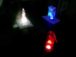 ●写真1枚目・2枚目…赤、青、緑、白、紫と様々な色のランプが輝いています。●写真3枚目…担任の作品です。