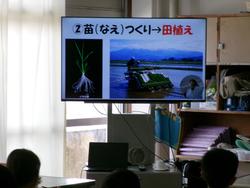 ●写真1枚目・2枚目・3枚目…スライドを見ながら田植えや稲刈りだけでなく、農家の方々が収穫までに行っている様々な取組(作業)について学びを深めました。