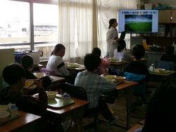 3年生は給食の時間にお米が収穫されるまでの流れについて学びました。給食を食べながら栄養士の話に耳を傾けていました。