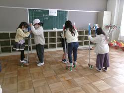 ●写真1枚目…2年生が1年生に竹馬を教えています。●写真2枚目…2年生が1年生にけん玉を教えています。●写真3枚目…コマ回しを楽しんでいます。